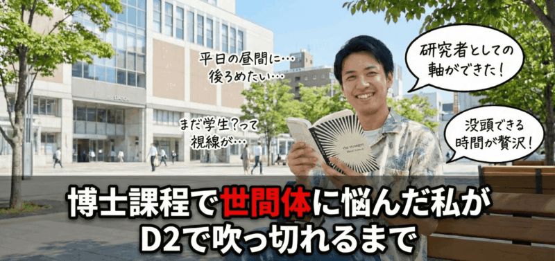 この記事では、博士課程の学生が抱える世間体の悩みについて、私自身の経験をもとにお話しします。これから博士課程へ進もうとしている方にも、今まさに渦中にいる方にも、何かしら響くものがあれば嬉しいです。