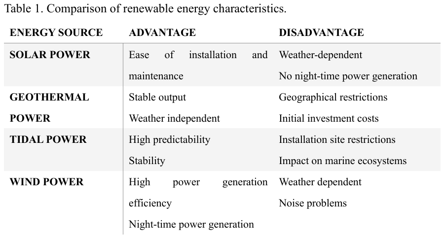 再生可能エネルギー(RE)は、電力供給の課題に対する有望な解決策として注目を集めている。主要な再生可能エネルギーは以下のような特徴を示している;