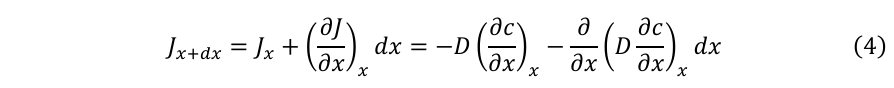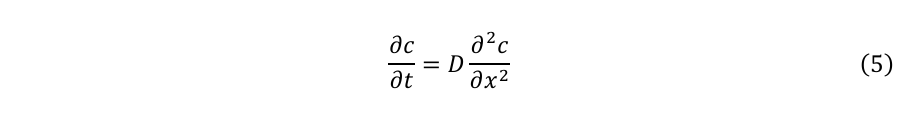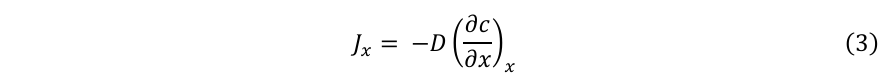 ここで、J [mol s-1 cm-2]は物質流束、D [cm2 s-1]は拡散係数である。拡散係数は、単位面積当たり単位時間に通過する物質量を特徴付ける。濃度と濃度勾配が時間とともに変化する非定常系に対しては、Fickの第二法則が適用される。