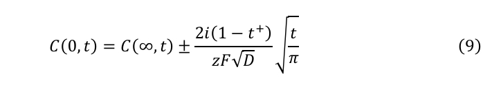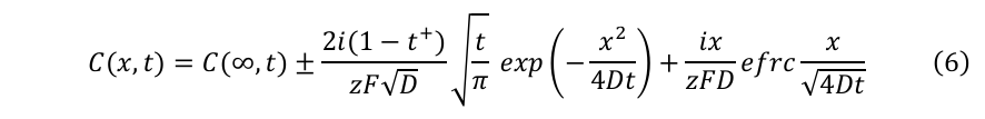 ここで、zは原子価、Fはファラデー定数、iは印加電流密度、t+はカチオンの輸率である。erfc関数は相補誤差関数であり、以下のように表される: