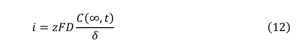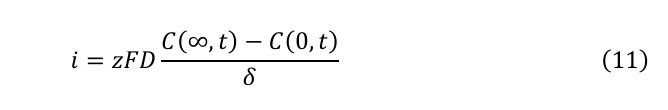 ここで、電極表面近傍では溶質の輸送は拡散が支配的となる。したがって、式(3)と拡散層厚さδを用いると、式(10)は式(11)となる: