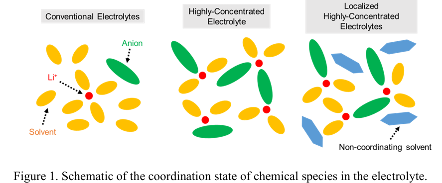 第三世代として登場した局所高濃度電解質(LHCEs)は、HCEsを非配位性溶媒で希釈することにより設計される。全体のリチウム塩濃度が1〜2 mol L-1でありながら、Li⁺の配位環境はHCEsと同等に維持される。粘度の低下と導電率の向上が同時に達成され、従来のHCEsの利点と従来型電解質の特性を組み合わせた電解質として注目を集めている。