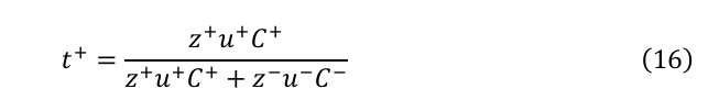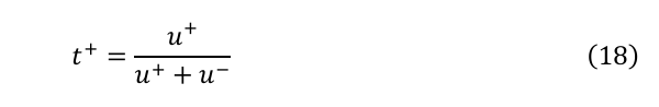 輸率は、特定のイオン種が運ぶ全電流の割合として定義される。二成分電解質において、カチオンの輸率t+は以下のように表される: