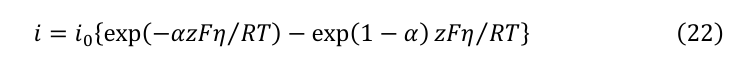ここで、i₀は交換電流密度、αは移動係数、ηは過電圧、Fはファラデー定数、Rは気体定数、Tは絶対温度である。この式は、電極反応における活性化障壁と過電圧の関係を定量的に記述する基本式として機能する。