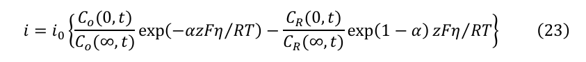 物質輸送が電極反応に関与する場合、電極表面のC(0,t)とバルクC(∞,t)における反応物濃度の比を考慮する必要がある。修正されたButler-Volmer式は以下のようになる: