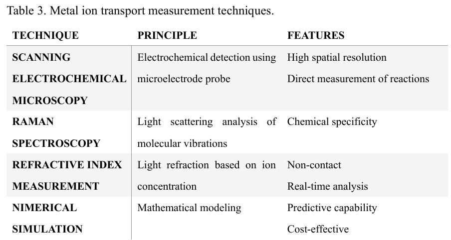 電極表面近傍における金属イオンの輸送現象を正確に理解することは、電気化学反応の本質を明らかにする上で不可欠である。表3に示されるように、金属イオンの濃度分布を測定するために、さまざまな手法が開発されてきた。各手法には独自の利点と制約が存在する。