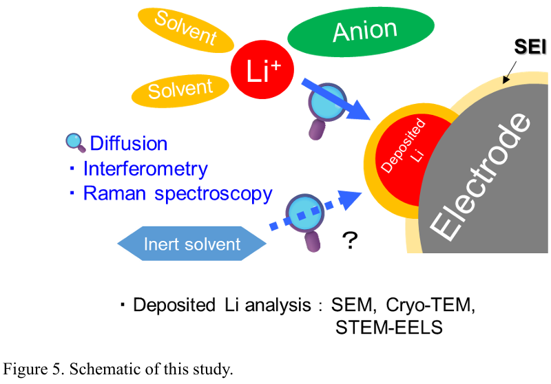本研究の目的は、イオン輸送から結晶成長に至る一連の過程を多層的に解析することで、リチウム金属の電析現象の本質を明らかにすることである。特に、図5に示されるように、拡散現象およびイオンの配位構造に注目し、デンドライトの成長や固体電解質界面(SEI)の形成との関係を体系的に検討する。