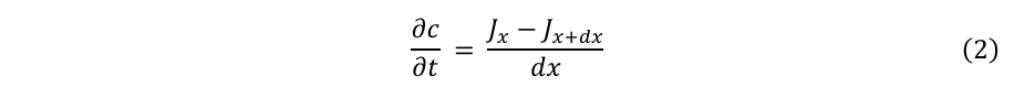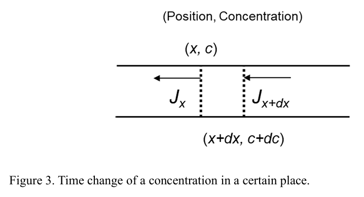 図3に示すように、単位断面積を持つ棒状の系において、位置xとx+dxの間の区間dxにおける時間的な濃度変化を考える。位置xにおける濃度cと、x+dxにおける濃度c+dcに対して、∂c/∂t > 0の場合、拡散は高濃度から低濃度に向かって生じる。dx内の濃度の時間変化は以下のように表される: