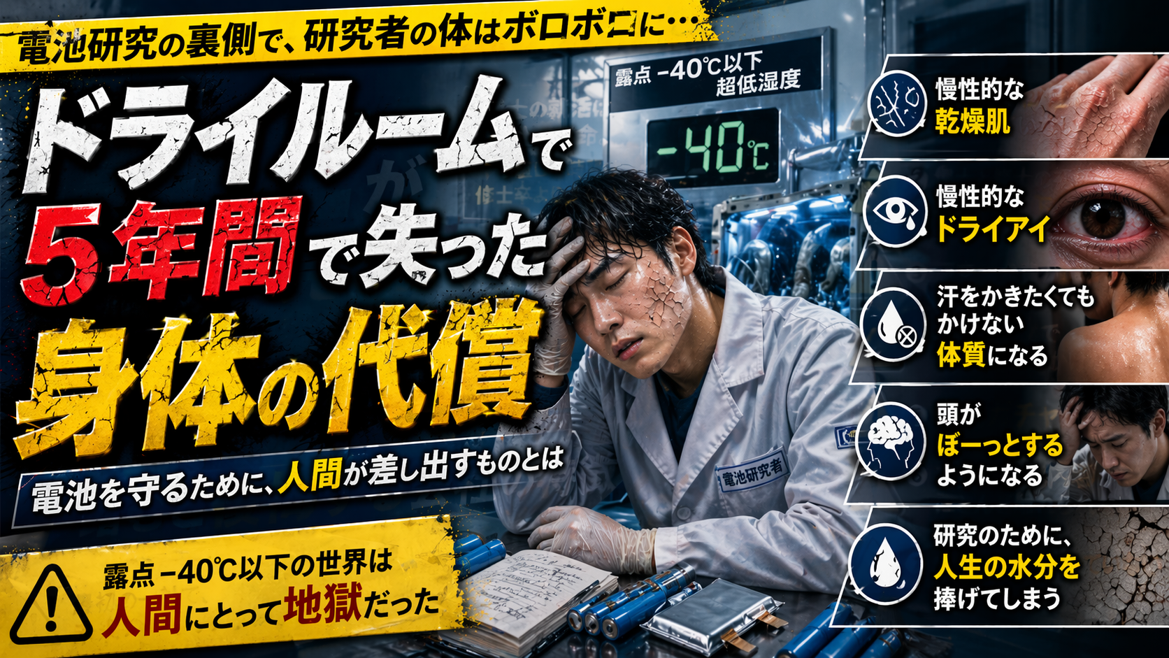 ここまで読んでくださった方には、ドライルームがいかに過酷な環境であるか伝わったのではないでしょうか。肌は干からび、目は乾き、汗をかく力すら失われ、最後には頭まで働かなくなっていく。『電池研究』というキラキラしたイメージの裏側には、研究者の体から水分をじわじわと絞り取るという、あまりにも地味な犠牲がひそんでいます。