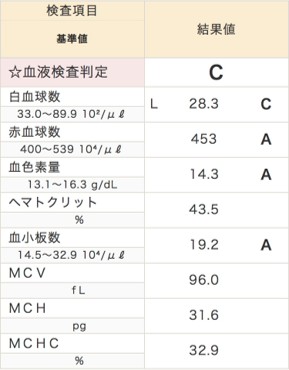 白血球が少ないのは、少なくてもやっていけるから。ランニングで体温が上昇する。体内の悪いヤツらが殺菌される。上裸で走るから、太陽光も皮膚表面のばい菌をやっつける。あとは覇気。目を血走らせて任侠力を示す。菌はビビり。すぐ逃げる。怖がりすぎて、体内へ侵入しようと試みすらしない。白血球の活躍する場面が無い以上、血液中に白血球を飼っていても仕方がない。だから、少ない。C判定だなんて仰々しい。ありがとうございます。