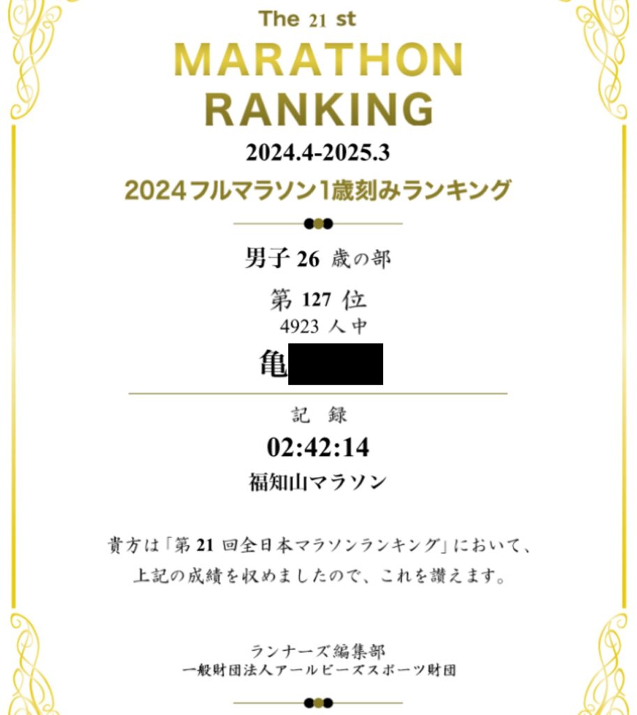 昨年度の自己ベストは2時間42分14秒。D2の11月、京都市内での学会発表翌日、福知山マラソンにて記録した。本来は2時間40分を切る予定だった。30kmを過ぎて足が重たくなった。徐々に失速して、わちゅごなしてしまった。それでも2時間42分。さすがに、さすがに100位圏内だろう。だって2時間42分だぞ。そこそこ速いんじゃないか…?