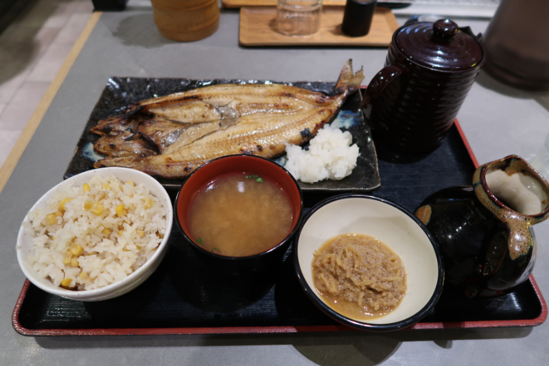 今回は王道のホッケ焼き定食。20分後に運ばれてきたホッケは、予備審査会で副査からガンガンに詰められて、「もう無理ですぅ~」と白旗を掲げる博士学生を思わせる姿。端から箸を入れてみると(黙れ)、魚汁がジュワッとあふれ出てきた。骨を取りつつ、白身を頬張る。ふわっふわ。雲を食べているよう。身も心もホッケホッケになった(黙れ)。
