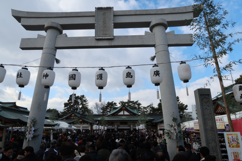 広島で最も初詣客の多い神社は『広島護国神社』。広島城下に居を構えて、戊辰戦争以来、150年以上もの歴史を誇る。普段は観光客で賑わっているが、三が日は境内が広島県民で六方最密充填構造となる。人が人を呼び、人どうしで押し潰しあい、検討に検討を重ねることで人間をもみじ饅頭にする。人口密度は山陽本線の出勤ラッシュと同じぐらいだろうか。