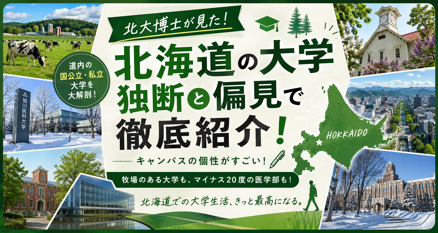 北海道の大学は、キャンパスの敷地に牧場があったり、最寄り駅がそのまま大学名だったり、マイナス20度の土地に医学部が建っていたりします。同じ北海道にありながら、大学ごとに学生の顔つきも校舎の雰囲気もまるで違っていて、大学間の振れ幅が大きいところが面白い。