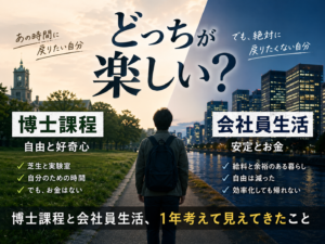 博士課程と会社員生活はどちらが楽しいか。一年抱え続けたこの問いについて、頭のなかで整理がついてきたので、書き出してみました。